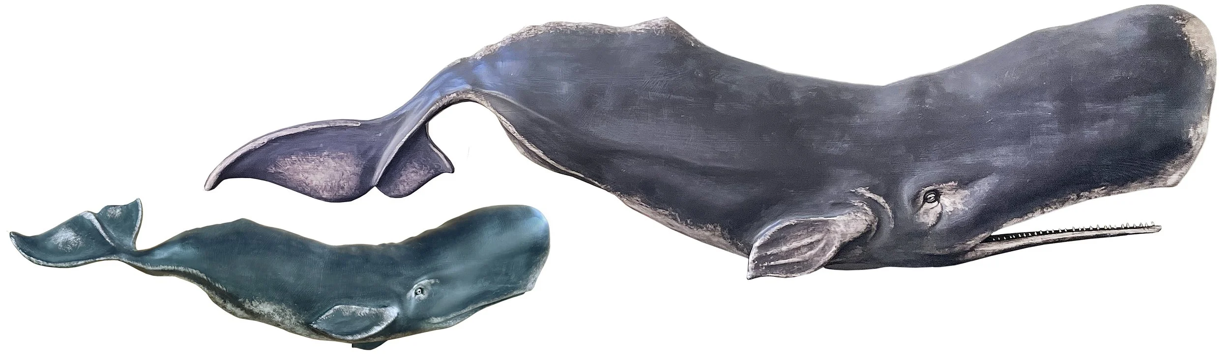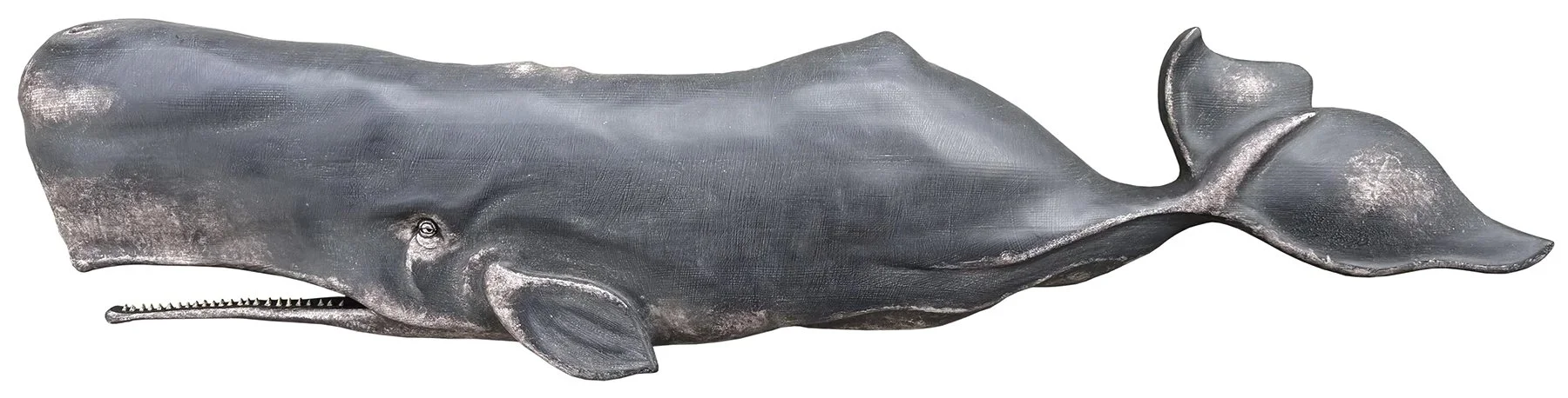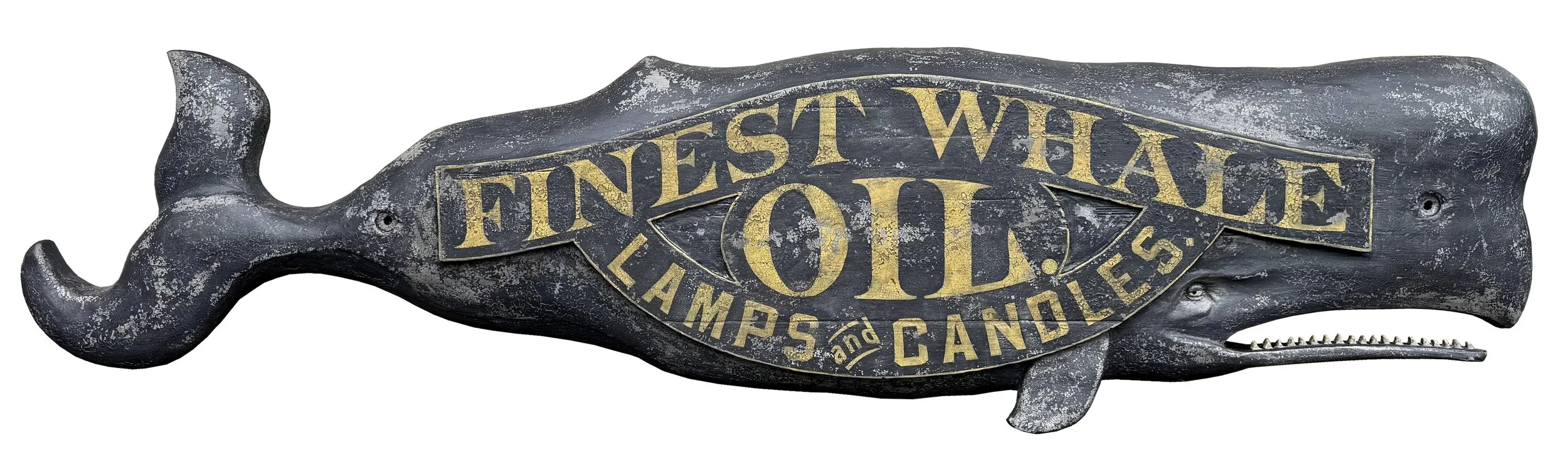 At six feet long and rich in detail and period accuracy, this wall hanging involved 1800s research and a touch of time-travel imagination. Our goal—using a folklore-inspired whale shape, early signwriter’s lettering styles, and a weathered finish—was to create something convincing and ultra-authentic to satisfy the museum curators who asked us to collaborate on an upcoming exhibit. We envisioned this sign hanging on the front of a Nantucket or New Bedford mercantile when the household need for whale oil was as vital as milk and bread. For centuries, sperm whale oil, also known as spermaceti, lit homes and cities around the world with its ultra-bright, odorless burn. It lubricated the Industrial Revolution until the 1859 discovery of Pennsylvania crude oil, which abruptly ended the whale oil industry and its centuries-old way of life for whaling communities worldwide.